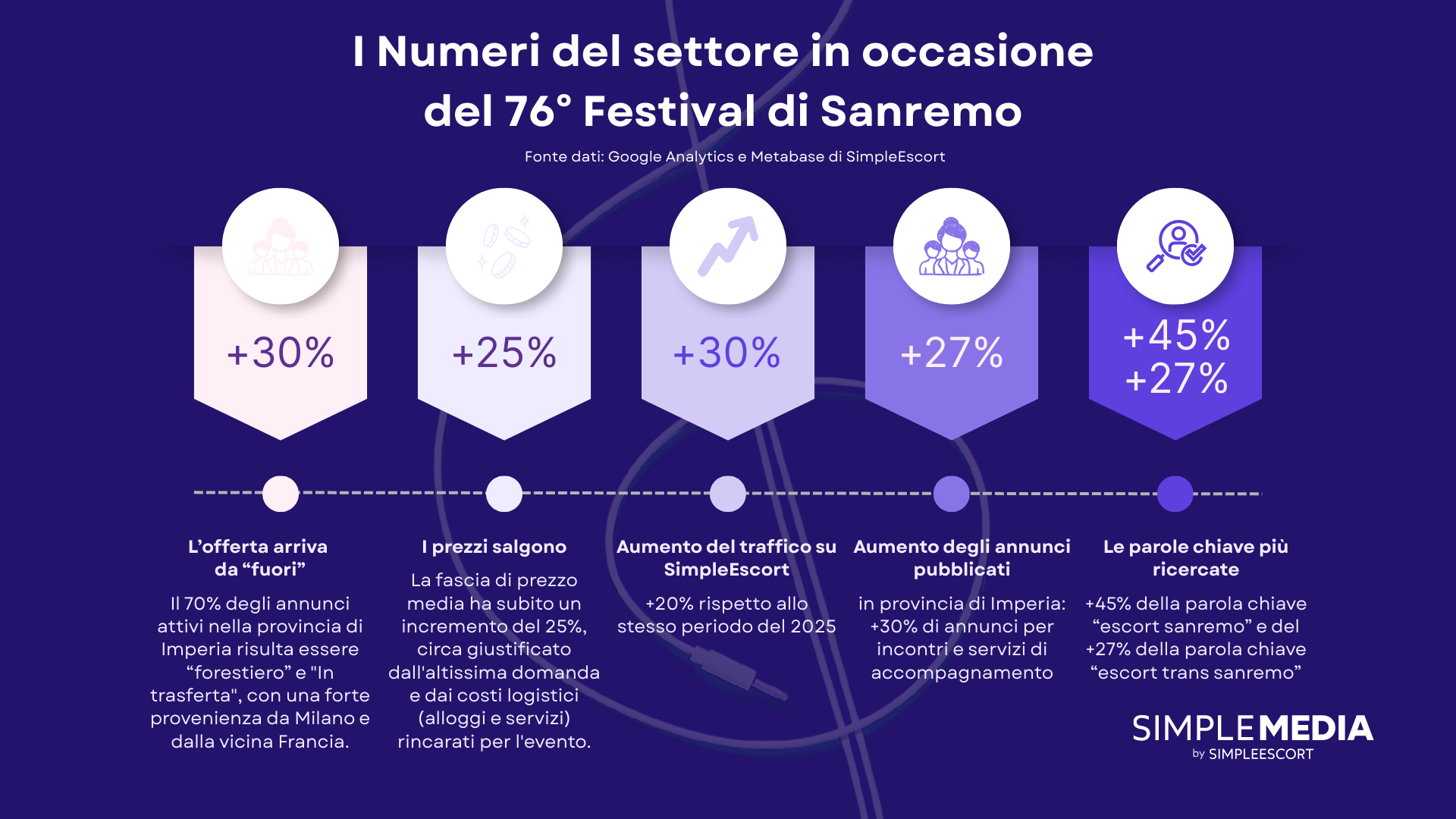 Secondo i dati di SimpleEscort, portale internazionale di annunci di intrattenimento per adulti, nella settimana che va da martedì 17 al 24 febbraio (giorno di inizio del Festival) le ricerche nella Città dei Fiori hanno registrato un +45% della parola chiave “escort sanremo” e del +27% della parola chiave “escort trans sanremo”.